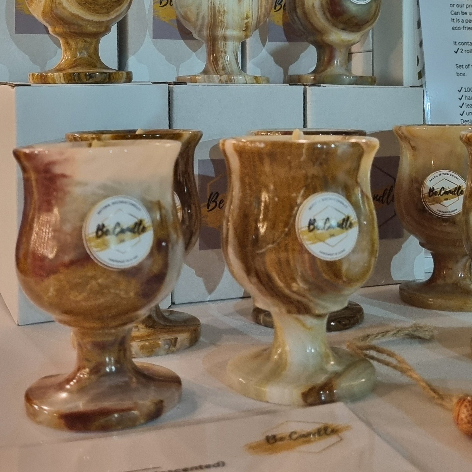 Designed and crafted in Dubai, this candle made of pure natural beeswax, with 100% cotton wick, in natural onyx vessel. Unscented.